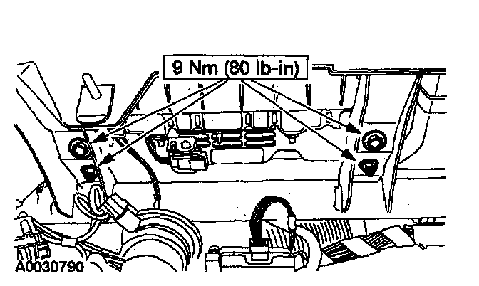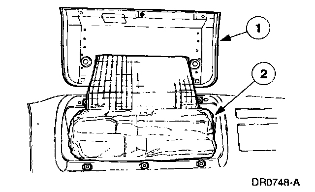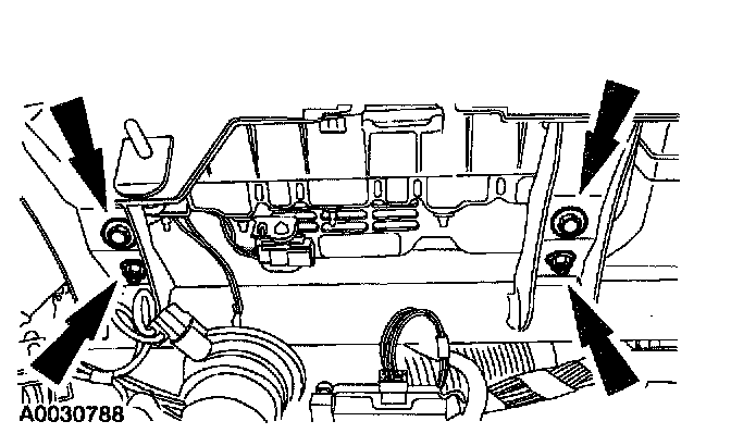 2. Through the glove box opening, remove the passenger air bag module retaining nuts and bolts.