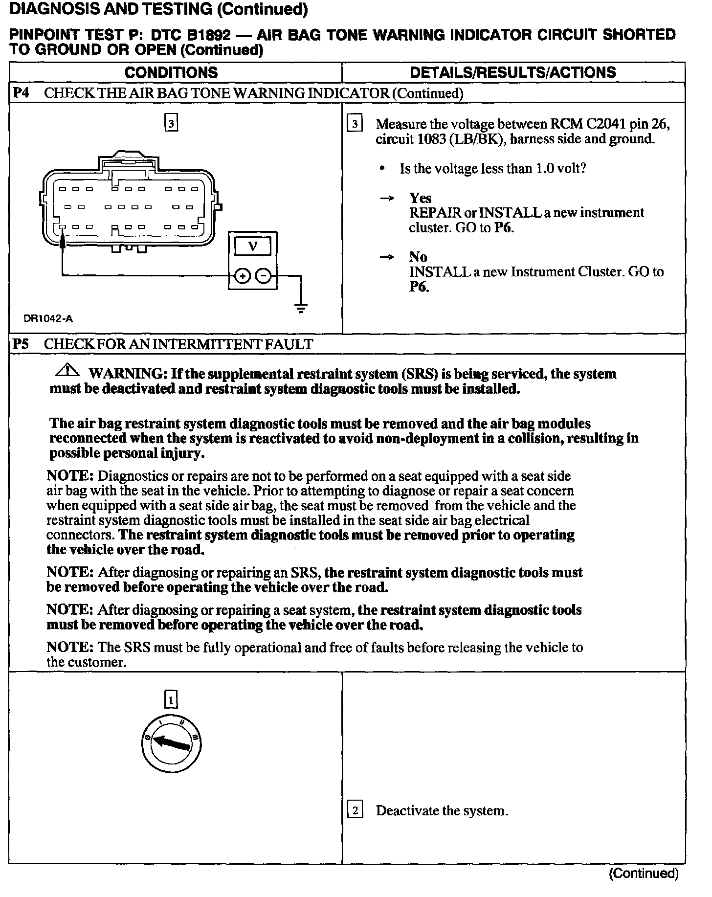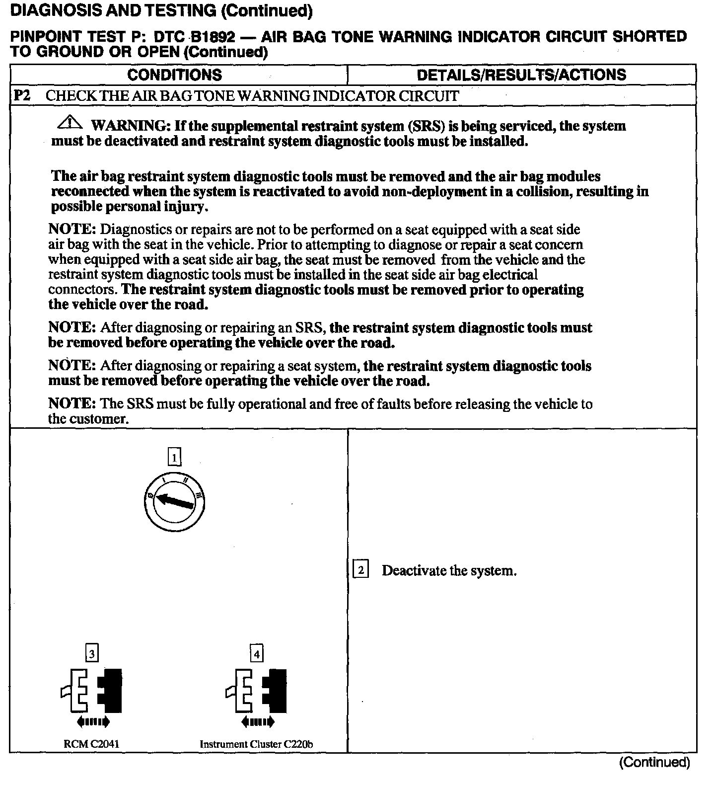 The Restraints Control Module (RCM) monitors its connection to the Instrument Cluster at C220b pin 10. This connection is used to signal a chime if the air bag indicator is inoperative and another SRS fault exists. If the RCM detects a short to ground or open on the connection to the Instrument Cluster, it will store a Diagnostic Trouble Code (DTC) B1892 in memory.