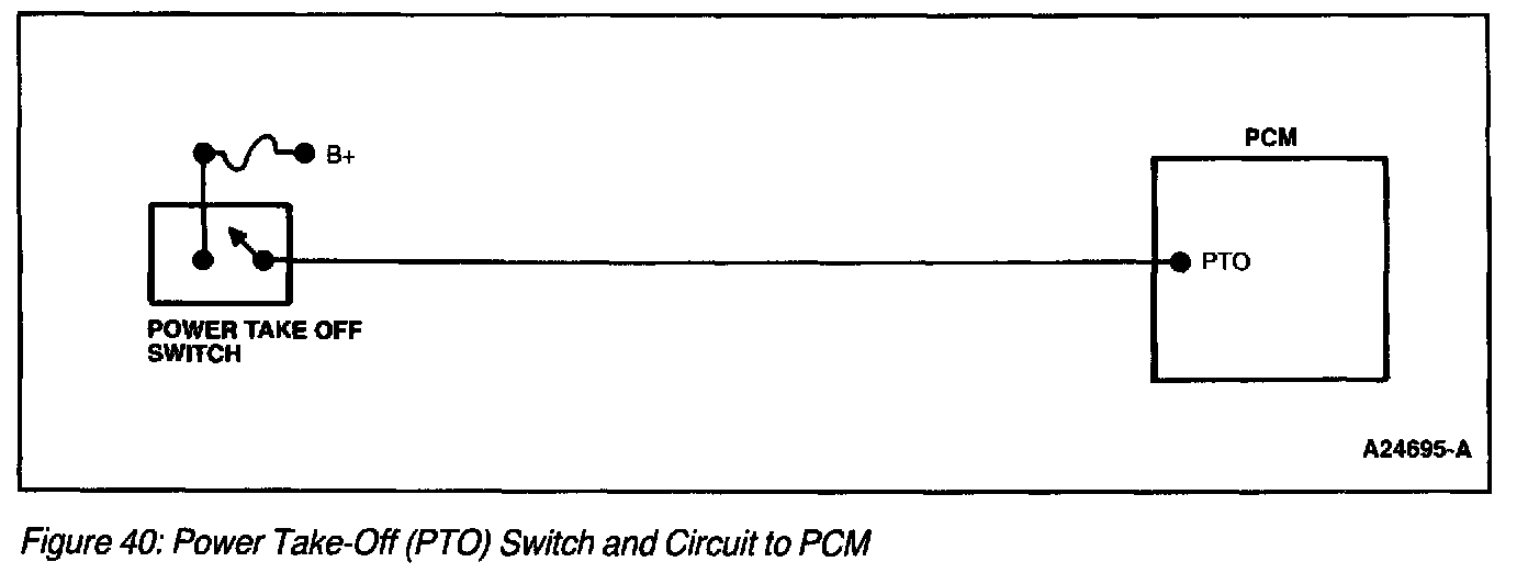 The Power Take-Off (PTO) circuit (Figure 40) is used by the PCM to disable some of the OBD II Monitors during PTO operation. The PTO circuit normally carries low voltage. When the PTO switch is on/closed, B+ is supplied to the PTO input circuit indicating to the PCM that an additional load is being applied to the engine. If this action was not reported by the PTO circuit, a false Diagnostic Trouble Code may be stored.