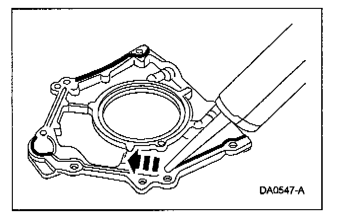 Apply a 4 mm (0.16 in) bead of silicone gasket and sealant around the rear oil seal retainer sealing surface.