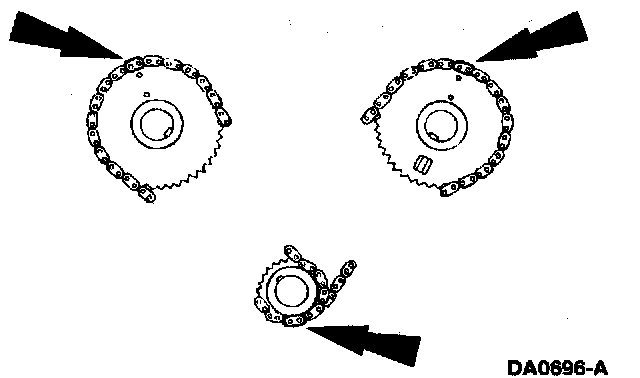 10. Position the crankshaft sprocket and lower end of the LH (inner) timing chain, aligning the timing marks.