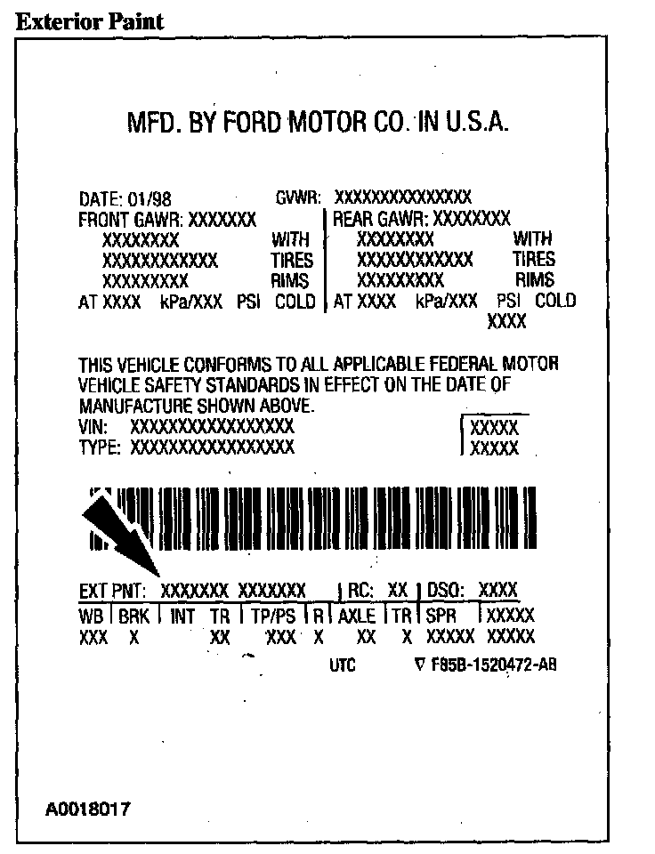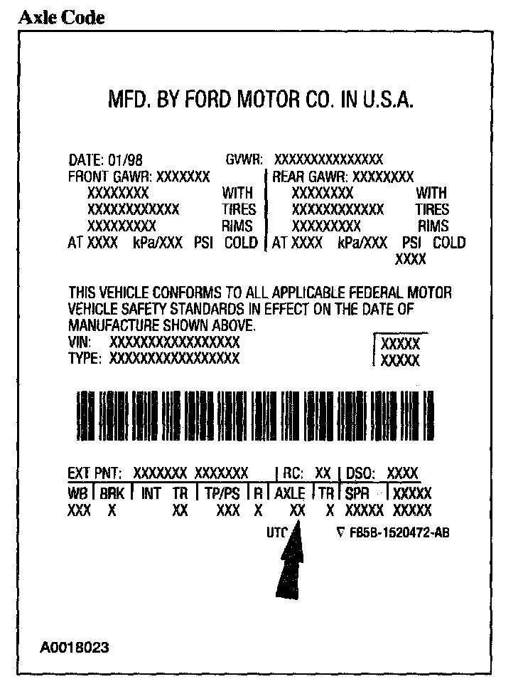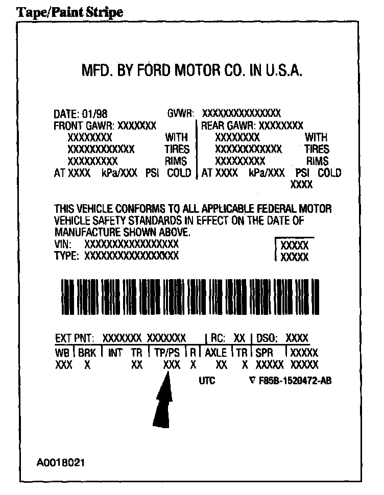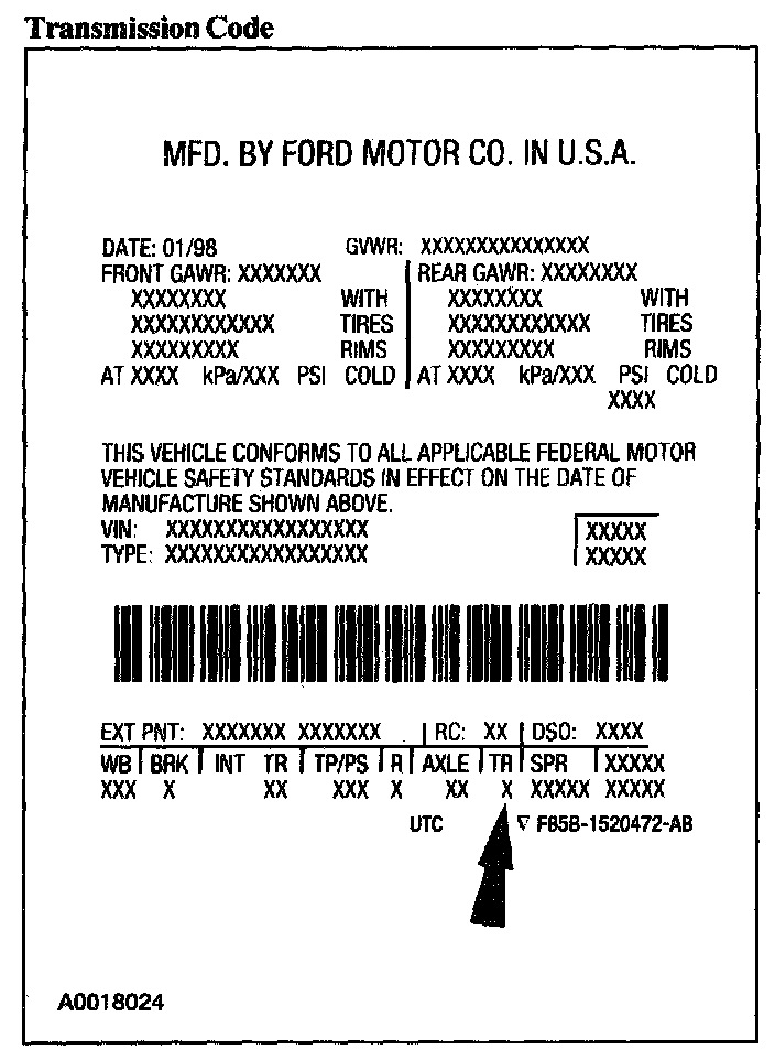 Powertrain calibration information is printed in the lower right corner of the Vehicle Certification (VC) Label. Only the base calibration information is printed. Revision levels will not appear, however, they can be found in On Line Automotive Service Information System (OASIS). For the current model year, Ford Motor Company is using three different protocols which describe powertrain base calibration. These protocols are designed to provide worldwide standardization for vehicle calibration. If the electronic calibration strategy has been used since 1998 and carried into the current model year, Protocol 1 will be used. Refer to Protocol 1. If the electronic calibration strategy has been used since 1999 and is carried into the current model year, Protocol 2 will be used. Refer to Protocol 2. For electronic calibration strategies introduced in the 2000 or 2001 model year, use Protocol 3. Refer to Protocol 3.