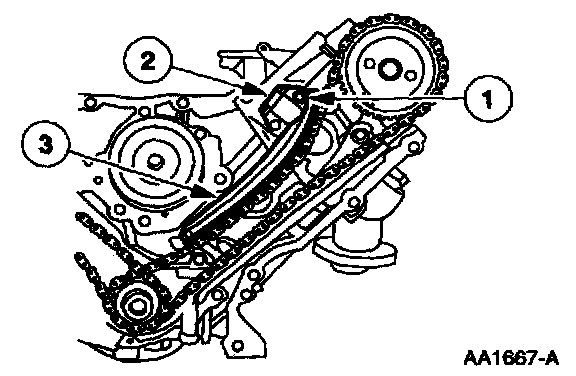 3. CAUTION: Unless otherwise instructed, at no time when the timing chains an removed and the cylinder heads are installed is the crankshaft or camshaft to be rotated. Severe piston and valve damage will occur.
