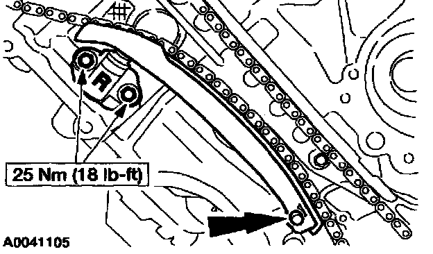 15. NOTE: The lower half of the timing chain must be positioned above the tensioner arm dowel.
