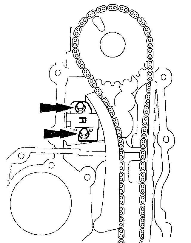 10. Position the RH timing chain tensioner and install the bolts.