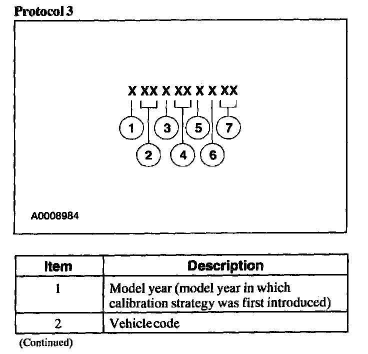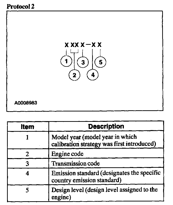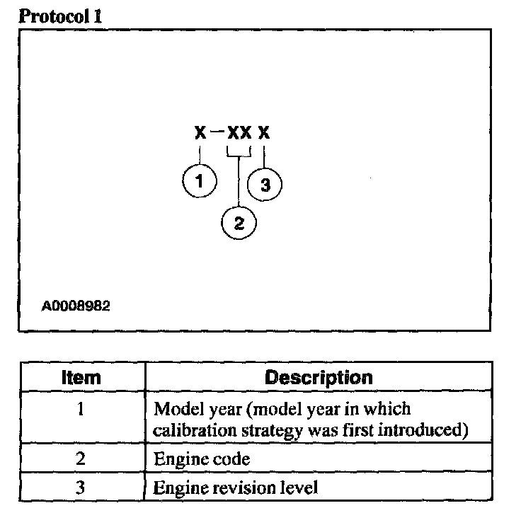 Powertrain calibration information is printed in the lower right corner of the Vehicle Certification (VC) Label. Only the base calibration information is printed. Revision levels will not appear, however, they can be found in On Line Automotive Service Information System (OASIS). For the current model year, Ford Motor Company is using three different protocols which describe powertrain base calibration. These protocols are designed to provide worldwide standardization for vehicle calibration. If the electronic calibration strategy has been used since 1998 and carried into the current model year, Protocol 1 will be used. Refer to Protocol 1. If the electronic calibration strategy has been used since 1999 and is carried into the current model year, Protocol 2 will be used. Refer to Protocol 2. For electronic calibration strategies introduced in the 2000 or 2001 model year, use Protocol 3. Refer to Protocol 3.