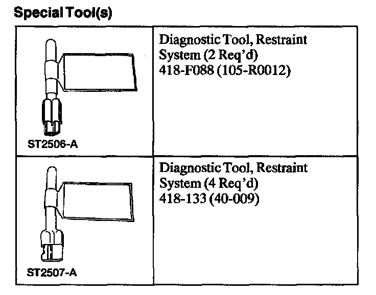 WARNING: THE RESTRAINT SYSTEM DIAGNOSTIC TOOL IS FOR RESTRAINT SYSTEM SERVICE ONLY. REMOVE FROM THE VEHICLE PRIOR TO ROAD USE. FAILURE TO REMOVE COULD RESULT IN INJURY AND POSSIBLE VIOLATION OF VEHICLE SAFETY STANDARDS.