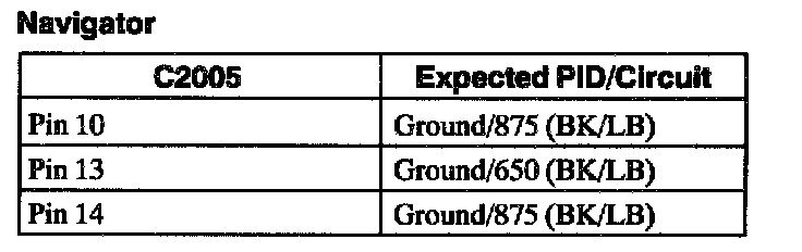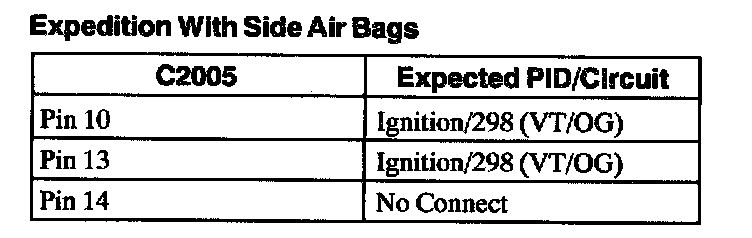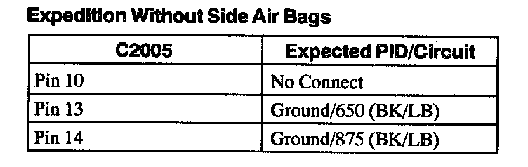 The Restraint Control Module (RCM) monitors the electrical condition at C2005 pins 10, 13 and 14 to determine if it is installed on the correct vehicle. Each vehicle configuration (Expedition with and without side air bags and Navigator with side air bags) will have a unique vehicle ID. See the tables. If the RCM detects other than the expected programmed condition on any of these pins, it will store Diagnostic Trouble Code (DTC) C1414 in memory and flash a Lamp Fault Code (LFC) 29 (or higher priority code if one exists) on the air bag indicator.