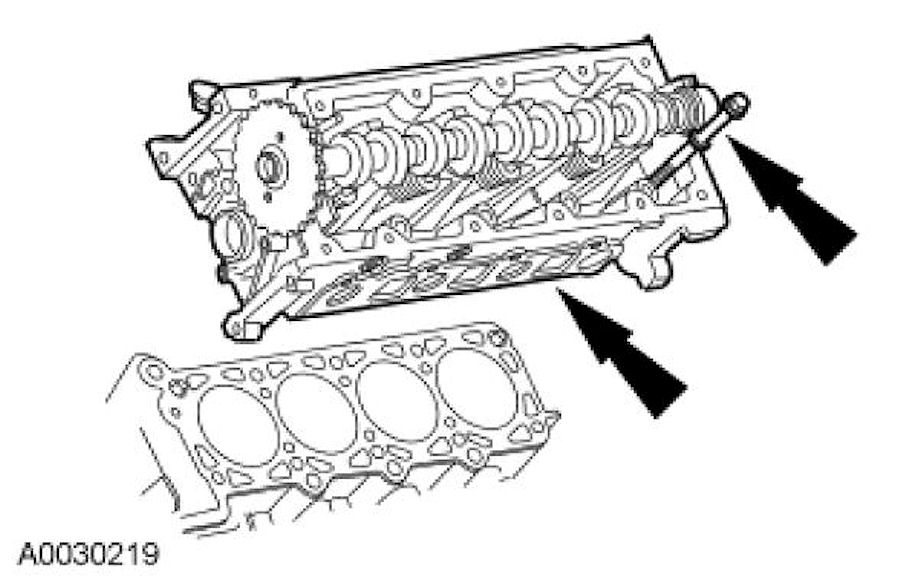 2. CAUTION: Cylinder head machining or milling is not authorized by the Ford Motor Company. Cylinder head flatness must be within 0.0254 mm (0.001 in) across a 38.1 mm (1.5 in) square area.