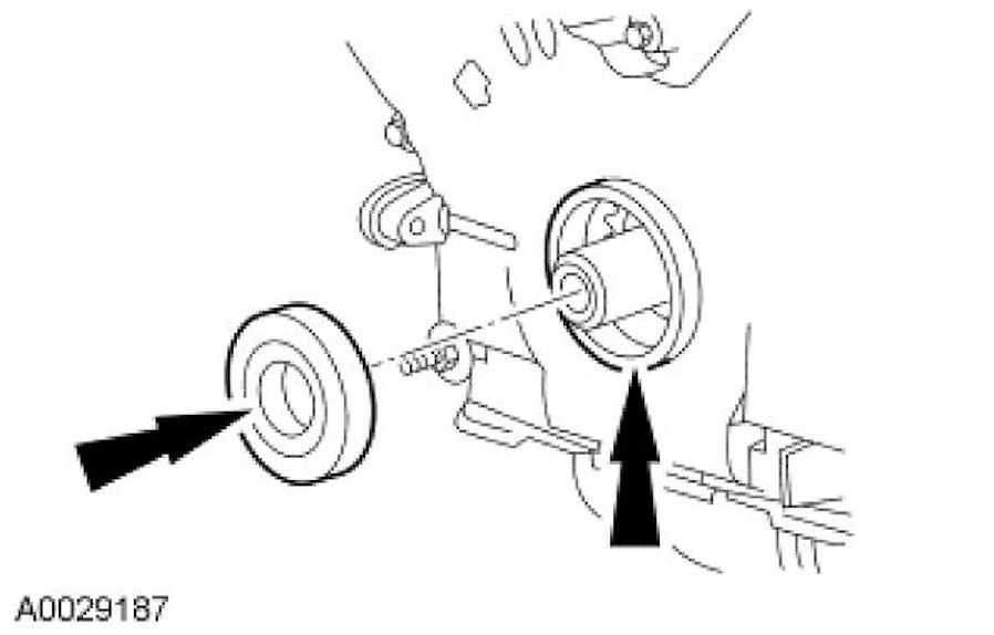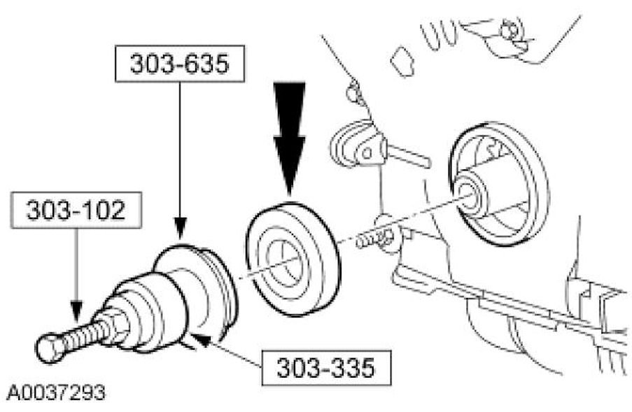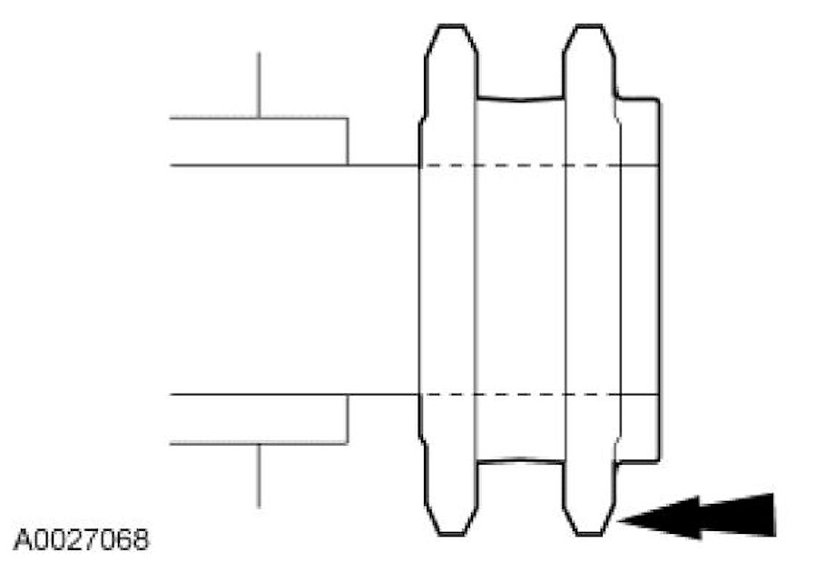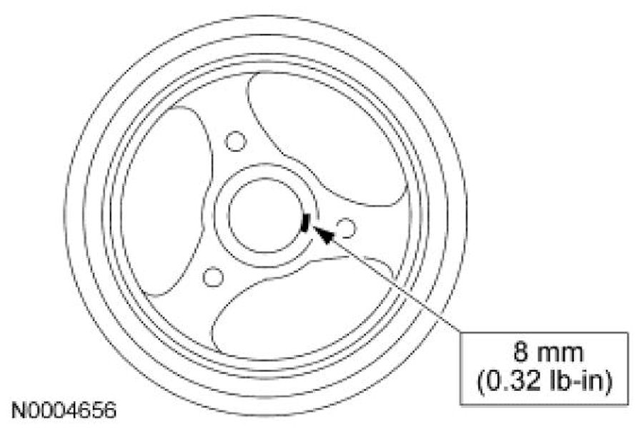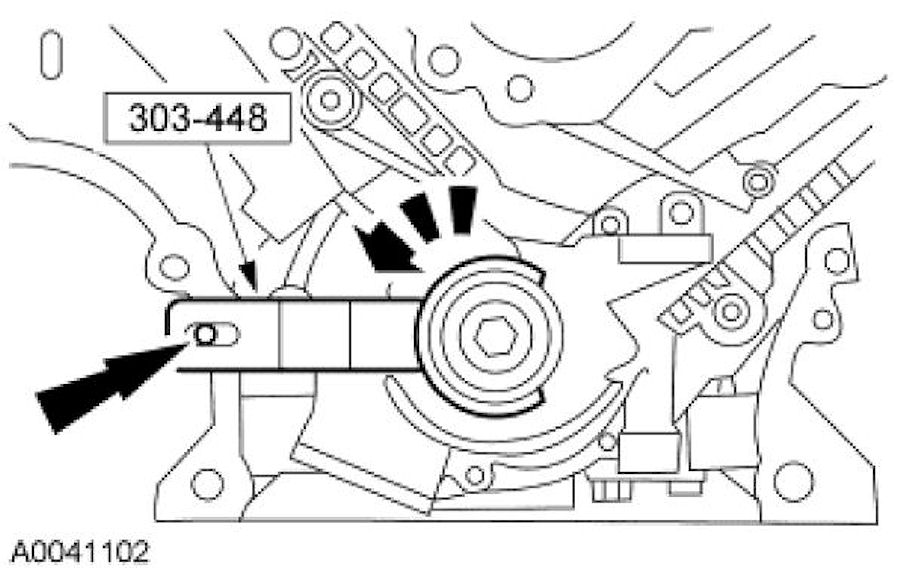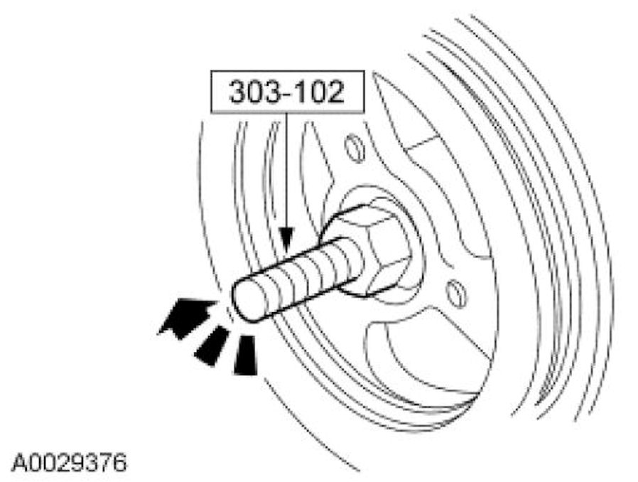 42. NOTE: Use a suitable strap wrench (303-D055) to hold the pulley while tightening the bolt.