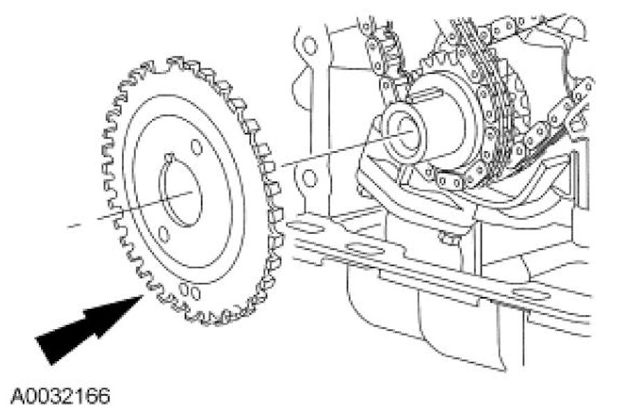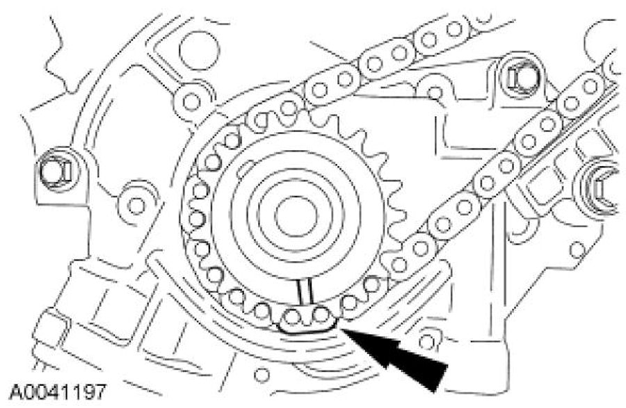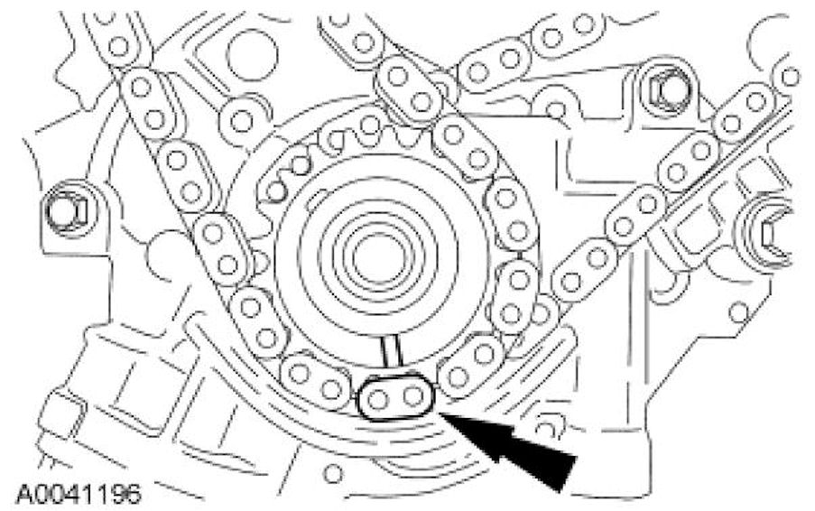 19. Position the lower end of the LH (inner) timing chain on the crankshaft sprocket, aligning the timing mark on the outer flange of the crankshaft sprocket with the single copper (marked) link on the chain.
