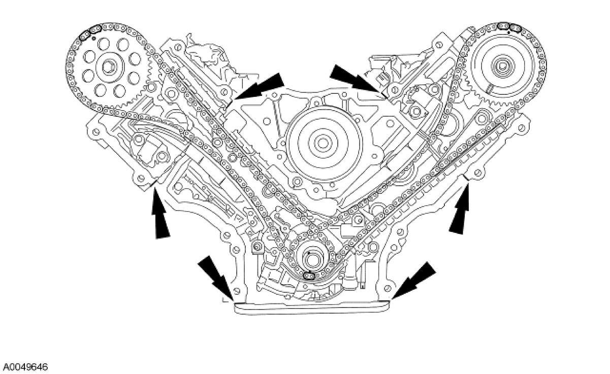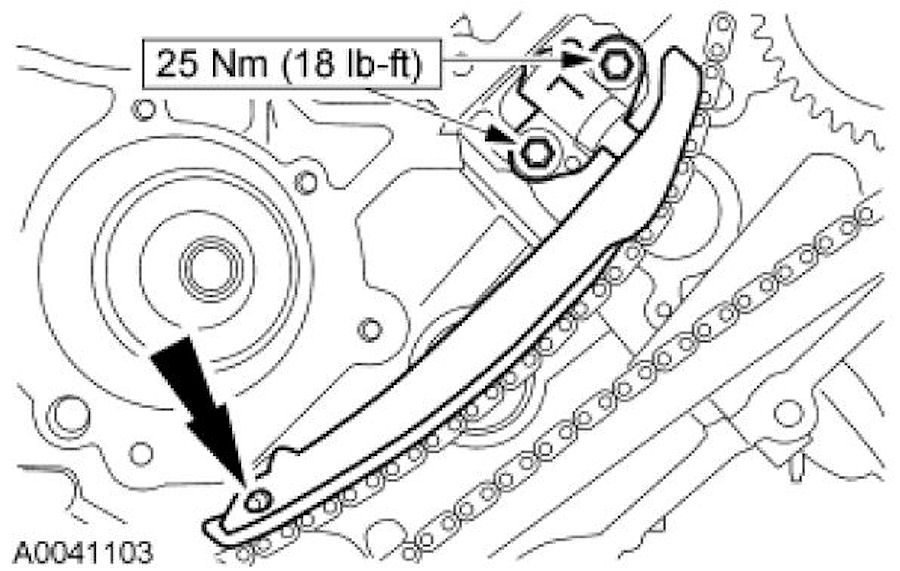 24. NOTE: The lower half of the timing chain must be positioned above the tensioner arm dowel.