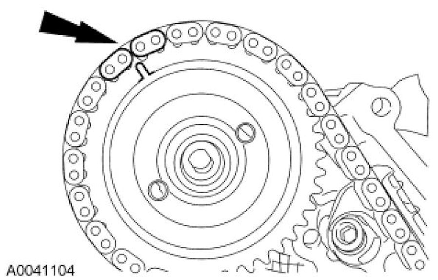 Position the timing chain on the camshaft sprocket with the camshaft sprocket timing mark positioned between the two copper (marked) chain links.