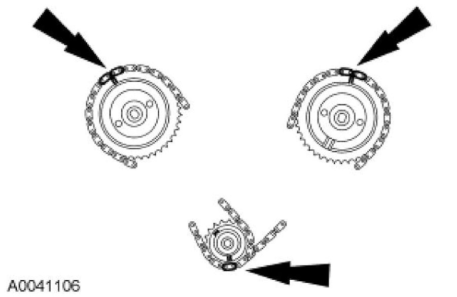 Position the RH timing chain on the camshaft sprocket. Make sure the camshaft sprocket timing mark is positioned between the two copper (marked) chain links.