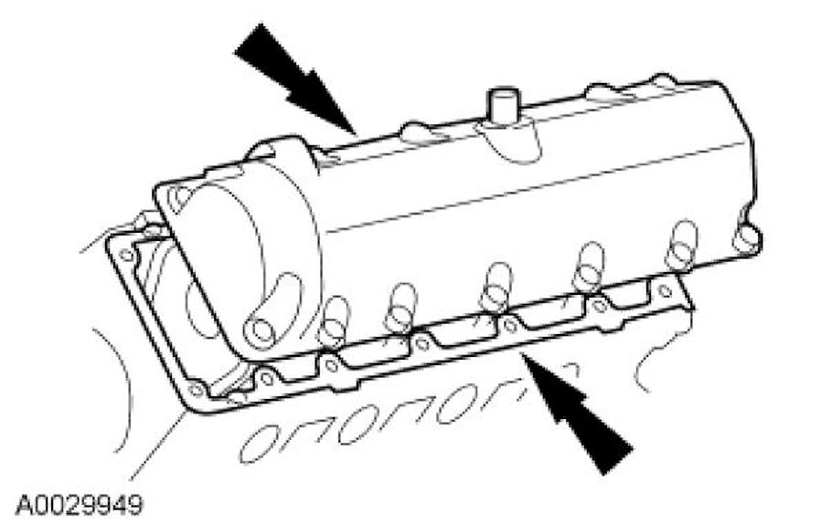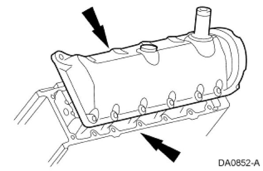 Apply a bead of silicone gasket and sealant along the cylinder head-to-cylinder block surface and the oil pan-to-cylinder block surface, at the locations shown.