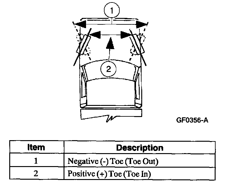 Toe is a measurement of how much the front of the wheels are turned in or out from the straight-ahead position. When the wheels are turned in, toe is positive (+)(toe in). When the wheels are turned out, toe is negative (-)(toe out). Toe is measured in degrees, from side to side and totaled.