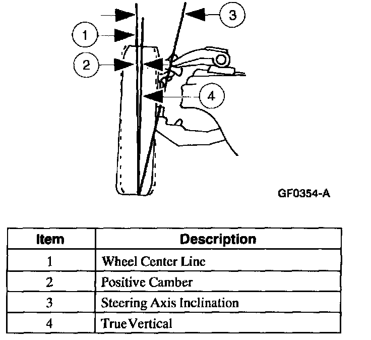 Steering axis inclination (included angle) is the center line drawn through the ball joints when viewed from the front.
