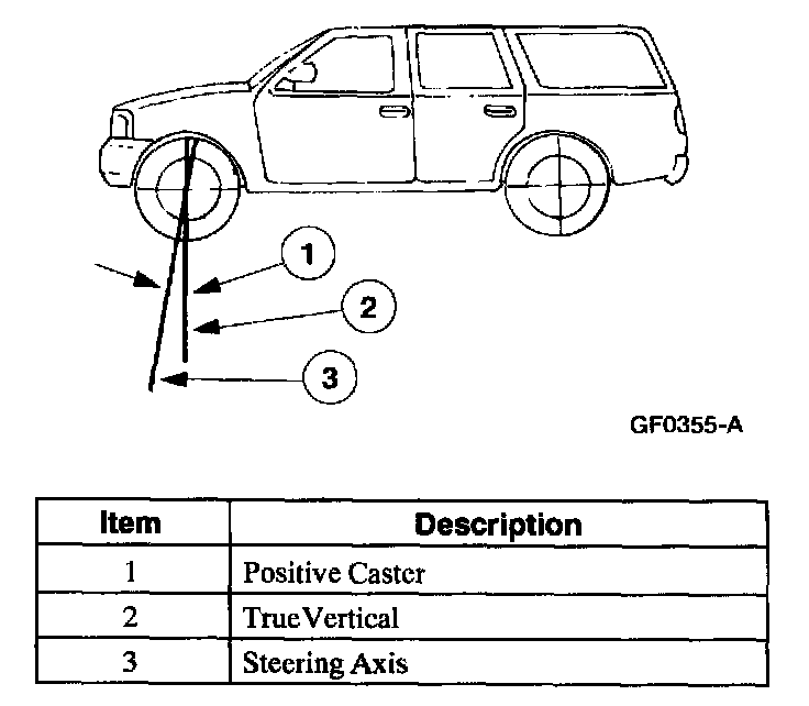 Caster is the tilting of the steering axis either forward or backward from vertical. A backward tilt is positive (+) and a forward tilt is negative (-).