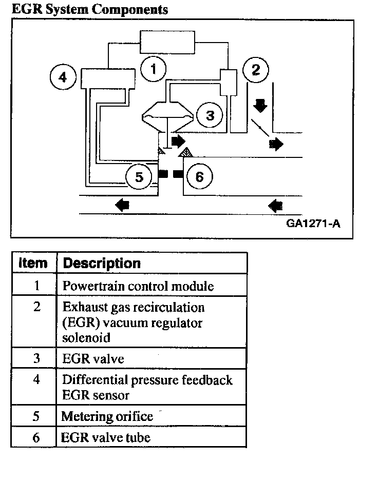 The powertrain control module controls the EGR vacuum regulator solenoid. The EGR vacuum regulator solenoid controls the vacuum to the EGR valve. When the EGR valve opens, exhaust gas flows to the intake manifold. The EGR transducer measures the flow through the EGR valve to exhaust manifold tube and sends a signal to the powertrain control module. A metering orifice in the EGR valve to exhaust manifold tube restricts the flow rate when the EGR valve is open.