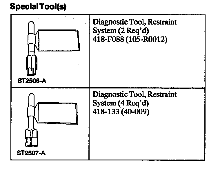 WARNING: THE RESTRAINT SYSTEM DIAGNOSTIC TOOL IS FOR RESTRAINT SYSTEM SERVICE ONLY. REMOVE FROM THE VEHICLE PRIOR TO ROAD USE. FAILURE TO REMOVE COULD RESULT IN INJURY AND POSSIBLE VIOLATION OF VEHICLE SAFETY STANDARDS.