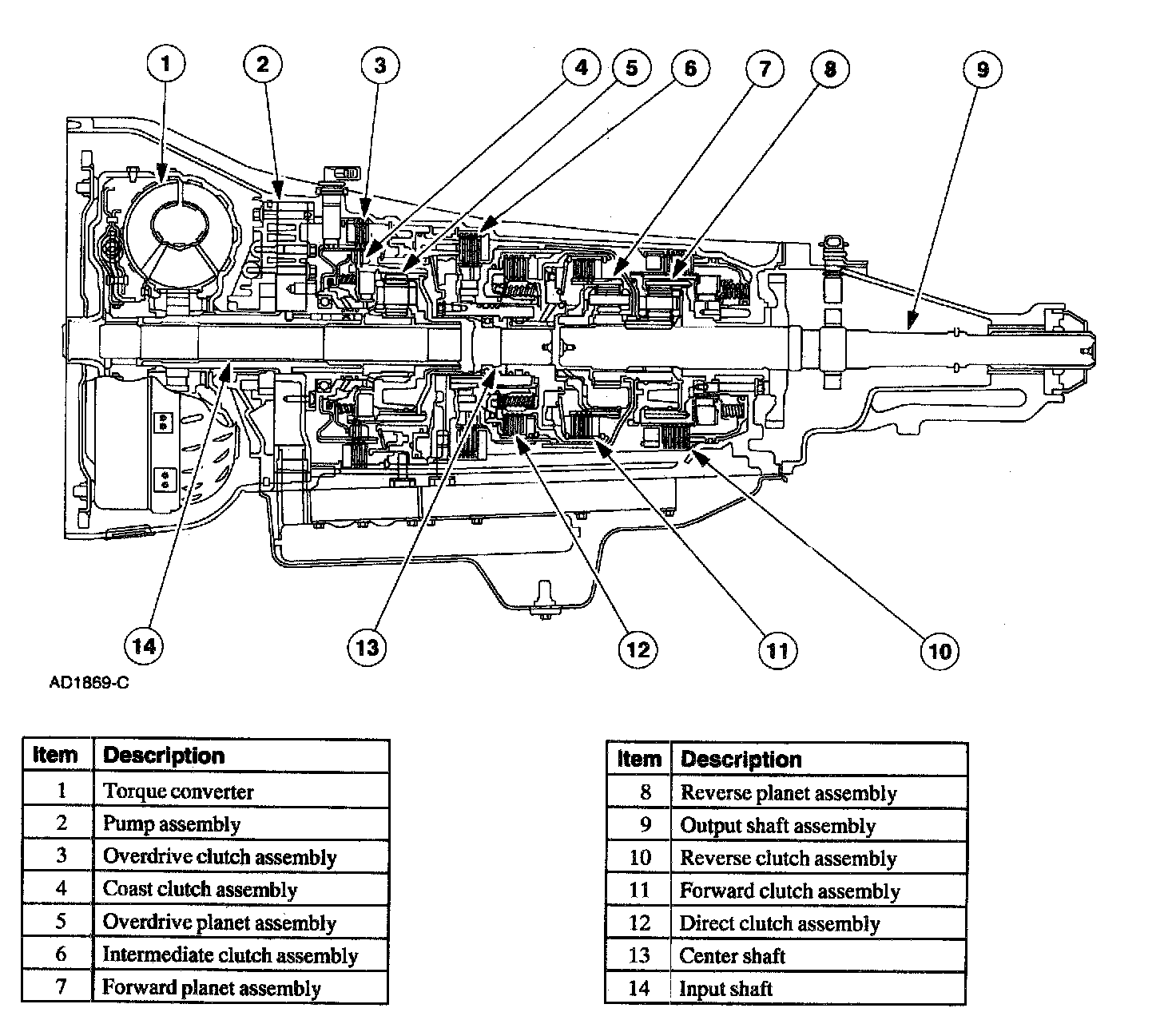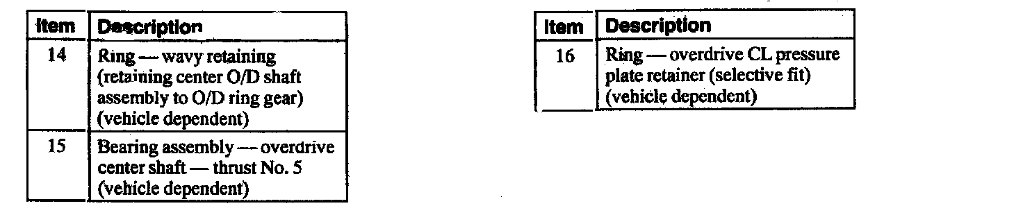 The outer race of the one-way clutch is splined to the overdrive ring gear which is splined to the center shaft. The center shaft is centered by the forward planetary assembly and is laterally held by needle; bearings on the center support and the overdrive planet assembly. The center shaft is splined into the forward clutch cylinder.