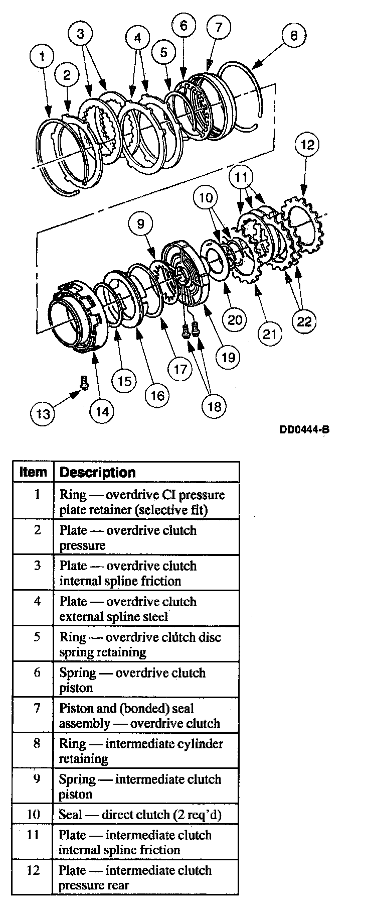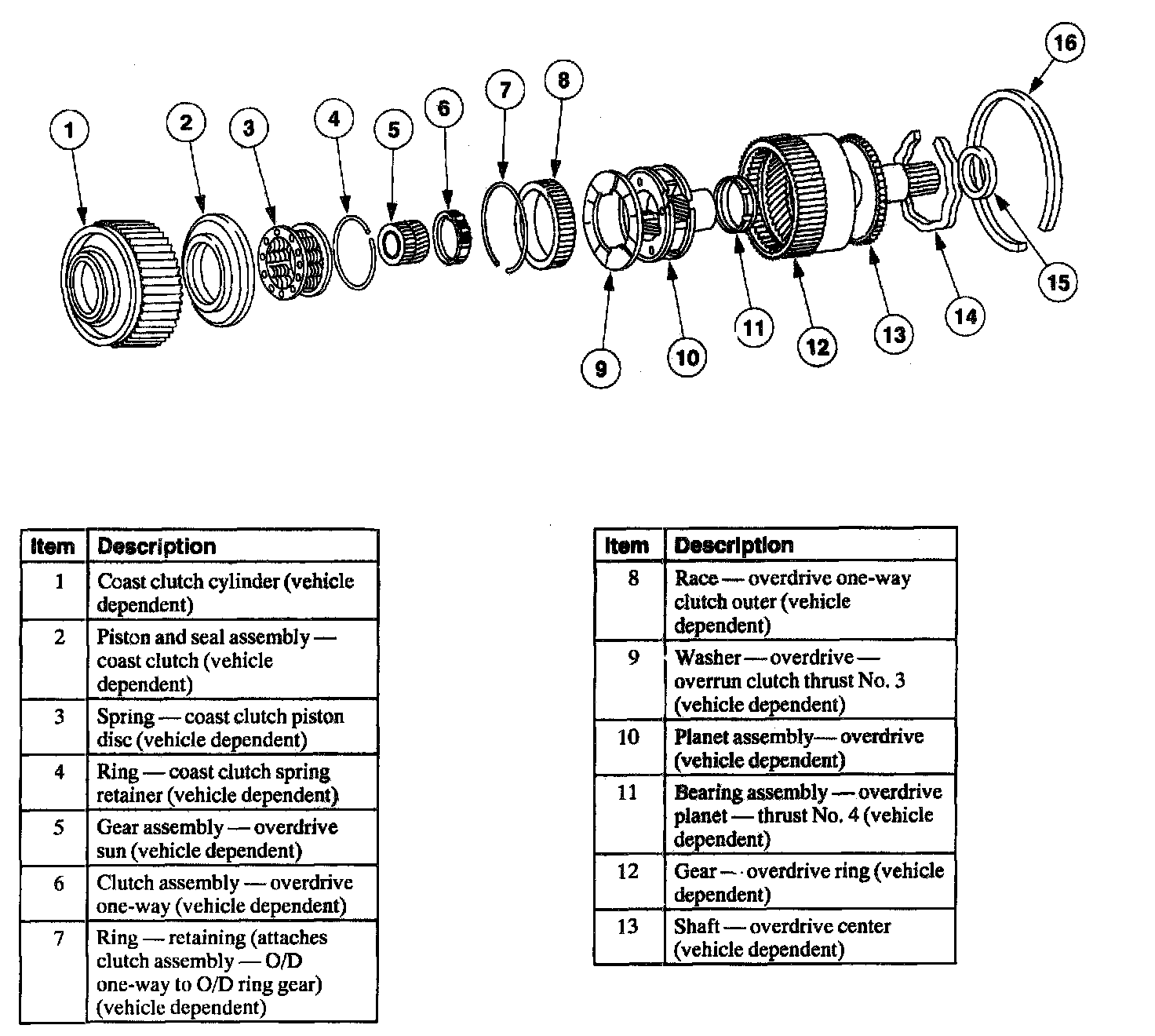 Two friction clutches are assembled in the overdrive planet assembly. The coast clutch is splined between the coast clutch cylinder and the overdrive ring gear.