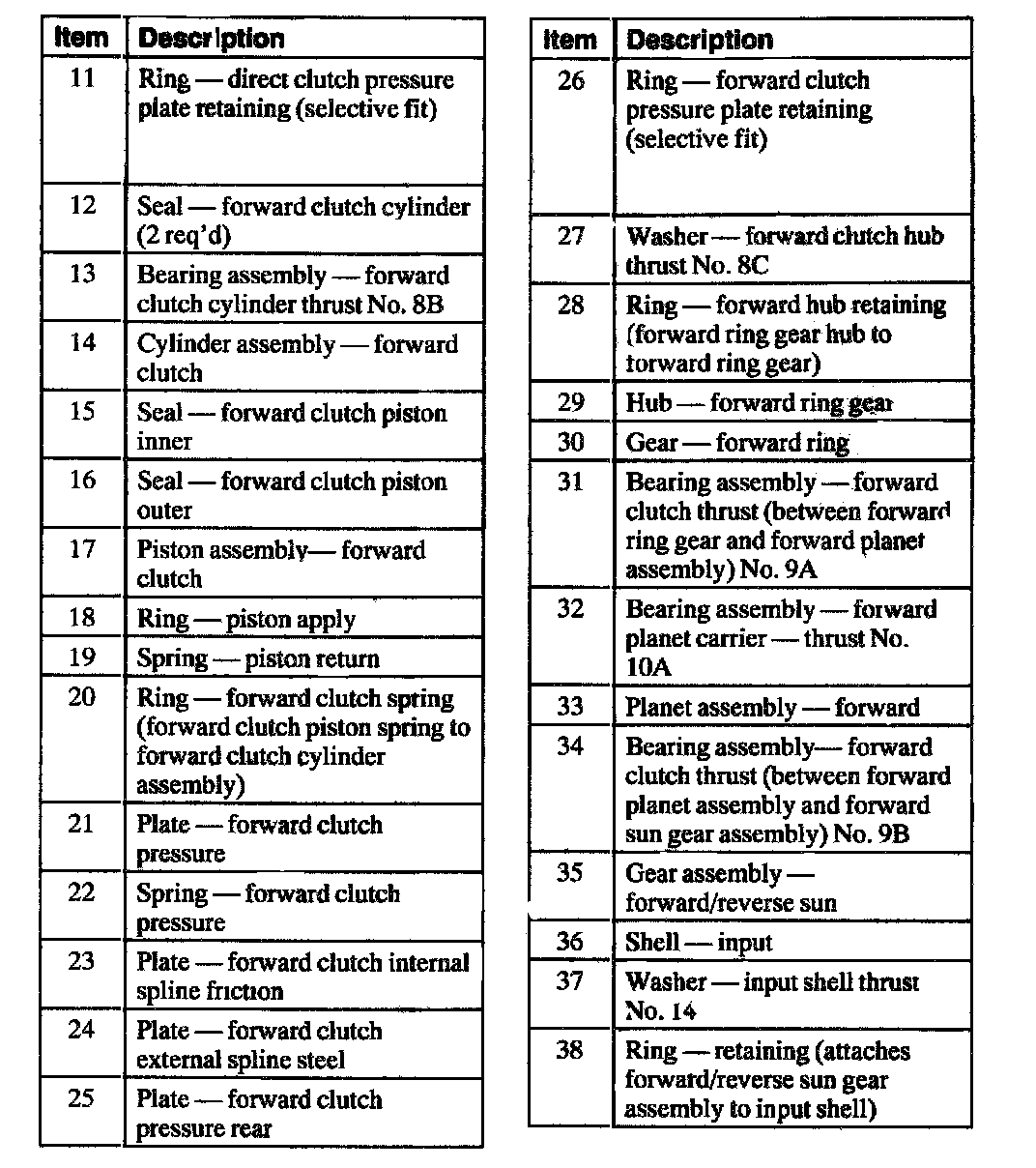 Two friction clutch assets, the direct clutch and the forward Clutch, are showy With the forward planetary assembly. The direct clutch assembly splines the forward clutch cylinder to the intermediate brake drum. The forward clutch assembly splines the forward clutch cylinder to the forward ring gear. The forward clutch is activated curing all forward gears. While in ; third or fourth gear; both the direct and forward clutches are applied to hold the forward planetary assembly arid enable it to act as a solid shaft.