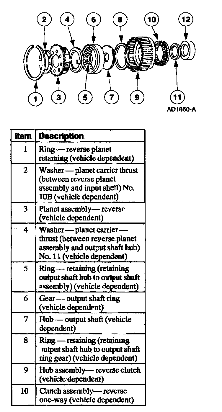 The reverse ring gear hub is splined to the output shaft and to the reverse ring gear. The reverse ring gear hub is laterally held by a needle bearing on the inner race of the low-reverse one-way clutch and a snap ring on the output shaft. The reverse planet assembly is splined to the low-reverse clutch hub. The low-reverse clutch hub is connected by the reverse clutch to the case. The inner race of the one-way clutch is bolted to the case.