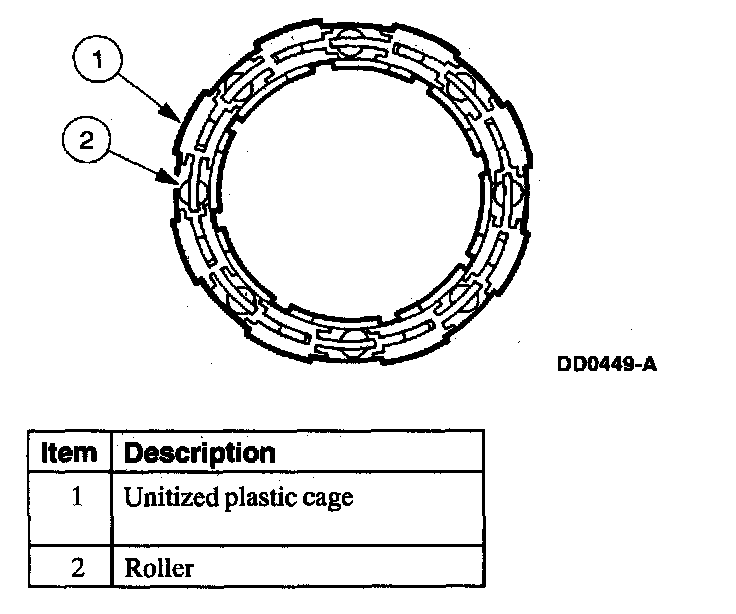 The overdrive one-way clutch, shown in the following illustration, transmits engine torque from the overdrive sun gear-to the overdrive ring gear in first, second and third gear range. We overdrive one-way clutch transmits power when the sprags are engaged between the inner end outer races. The inner race is spliced to the coast clutch cylinder which in turn is splined to the overdrive sun gear. The outer race is splined to the overdrive dug gear.