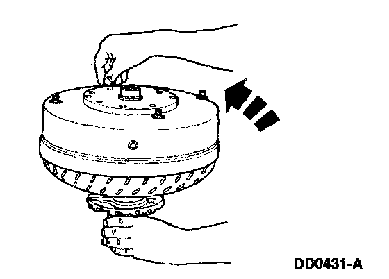 2. Mount the torque converter on the stator support so that the splines on the one-way clutch inner race engage the mating splines of the stator support.