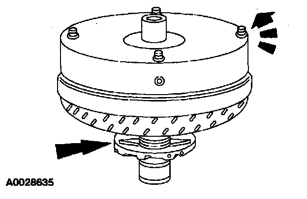 2. Mount the torque converter on the front pump support with the splines on the one-way clutch inner race, engaging the mating splines of the front pump support.