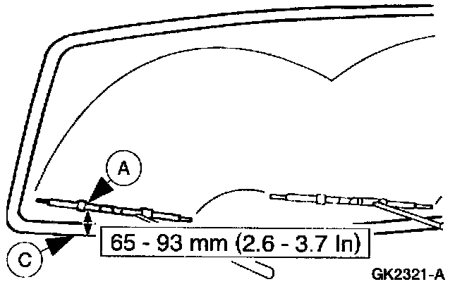 1. Cycle and park the windshield wipers.2. Verify the distance between the center of the (A) RR windshield wiper blade and the (C) bottom of the windshield glass is within specification.