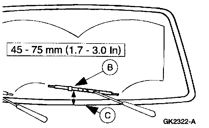 3. Verify the distance between the center of the (B) LH windshield wiper blade and the (C) bottom of the windshield glass is within specification.