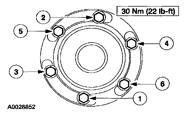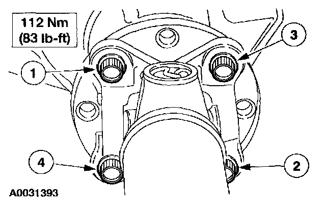 43. Tighten the front driveshaft flange bolts in the sequence shown.