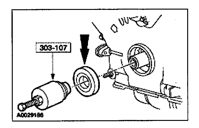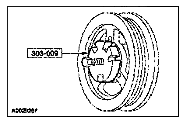 51. Remove the crankshaft pulley bolt. Using the special tool, remove the crankshaft pulley.