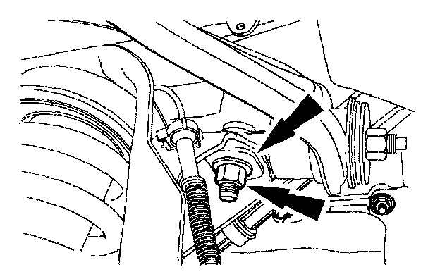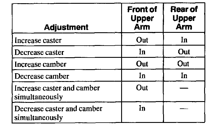 Camber and Caster Adjustment-Front1. NOTE: The upper arm-to-frame mounting bolts have set shims that must be replaced with washers to allow for adjustment of the arm in the frame slot. The vehicle should be supported by the lower arm to ease movement of the upper arm in the slot.