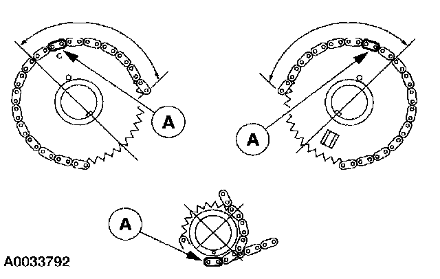 Make sure that the (A) copper marks on the timing chain are lined up with the corresponding dots on the crankshaft sprockets and the camshaft sprockets.