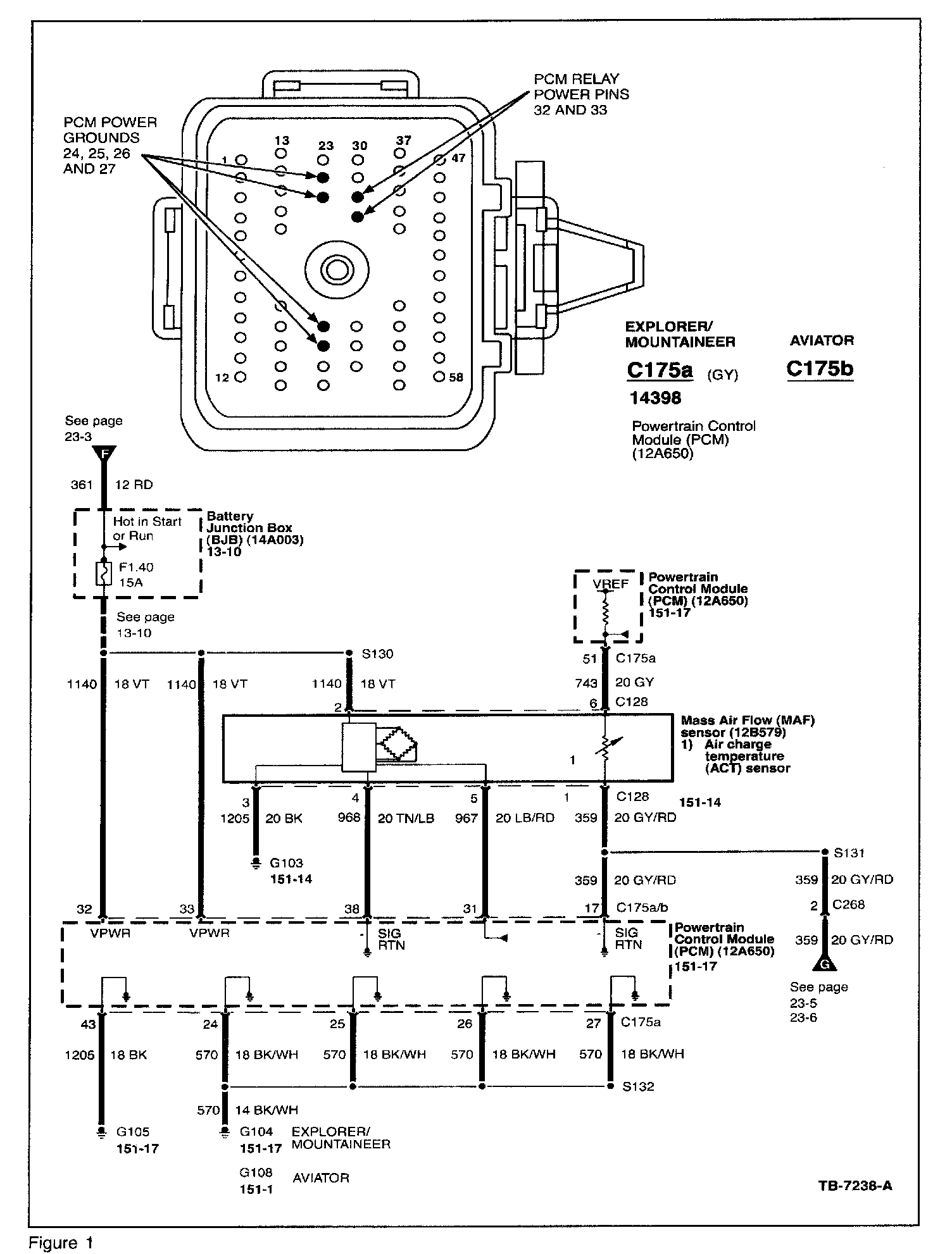 ^ With one lead of voltmeter connected to known good ground, check pins 32 and 33 on bottom PCM connector as shown on Figure 1.