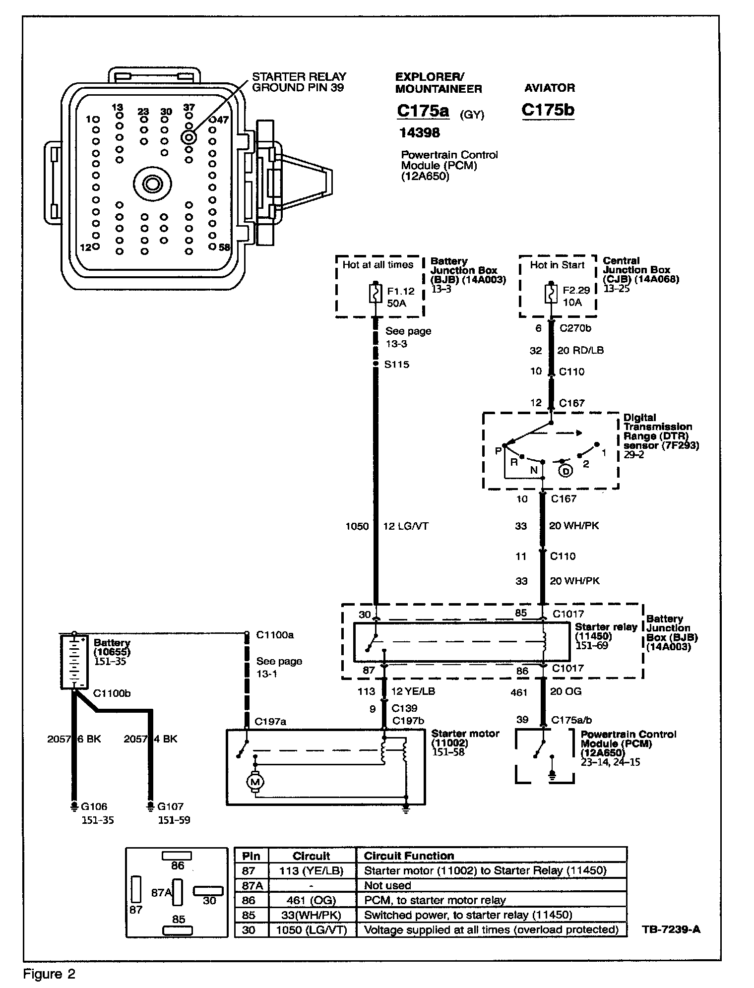 ^ Check starter relay by temporarily swapping with relay from unrelated circuit. See Explorer/Mountaineer or Aviator Wiring Diagram, Section 11, for illustration of relay locations in BJB.
