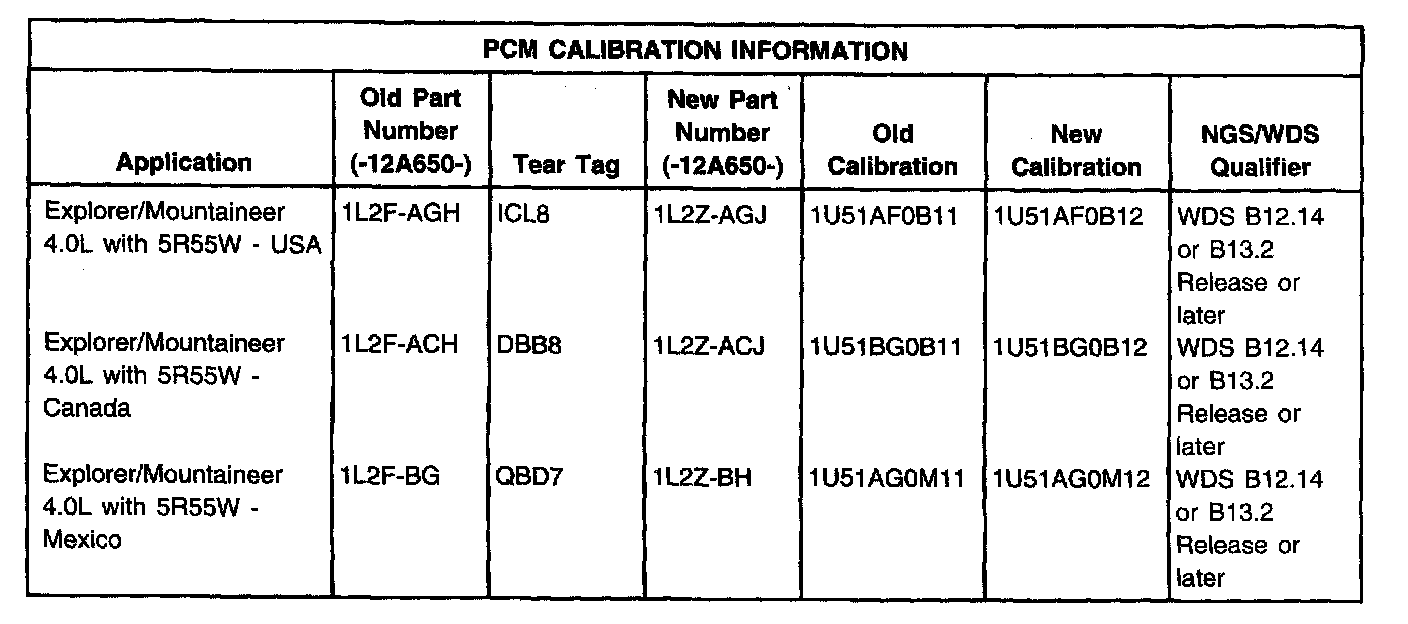 Verify that at light throttle, the 2-3 shift is delayed, soft or long between 16-40 km/h (10-25 mph) or the 3-4 shift is harsh between 32-56 km/h (20-35 mph). Prior to performing any service procedures, verify tear tag information. Refer to the PCM Calibration Information Chart in this article. If the calibration is not at the latest level, follow the procedures found in the Powertrain Control/Emissions Diagnosis (PC/ED) Service Manual to reprogram the PCM to latest calibration level.