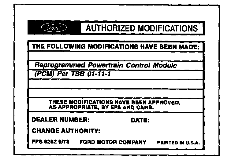 Obtain an Authorized Modifications Decal (FPS 8262 - obtainable through DOES II, 25/pkg) and list the date, dealer number, and summary of modifications performed. Select a prominent place adjacent to the Vehicle Emission Control Information Decal suitable for installing the Authorized Modifications Decal. Clean the area, install the decal, and cover it with a clear plastic decal shield.