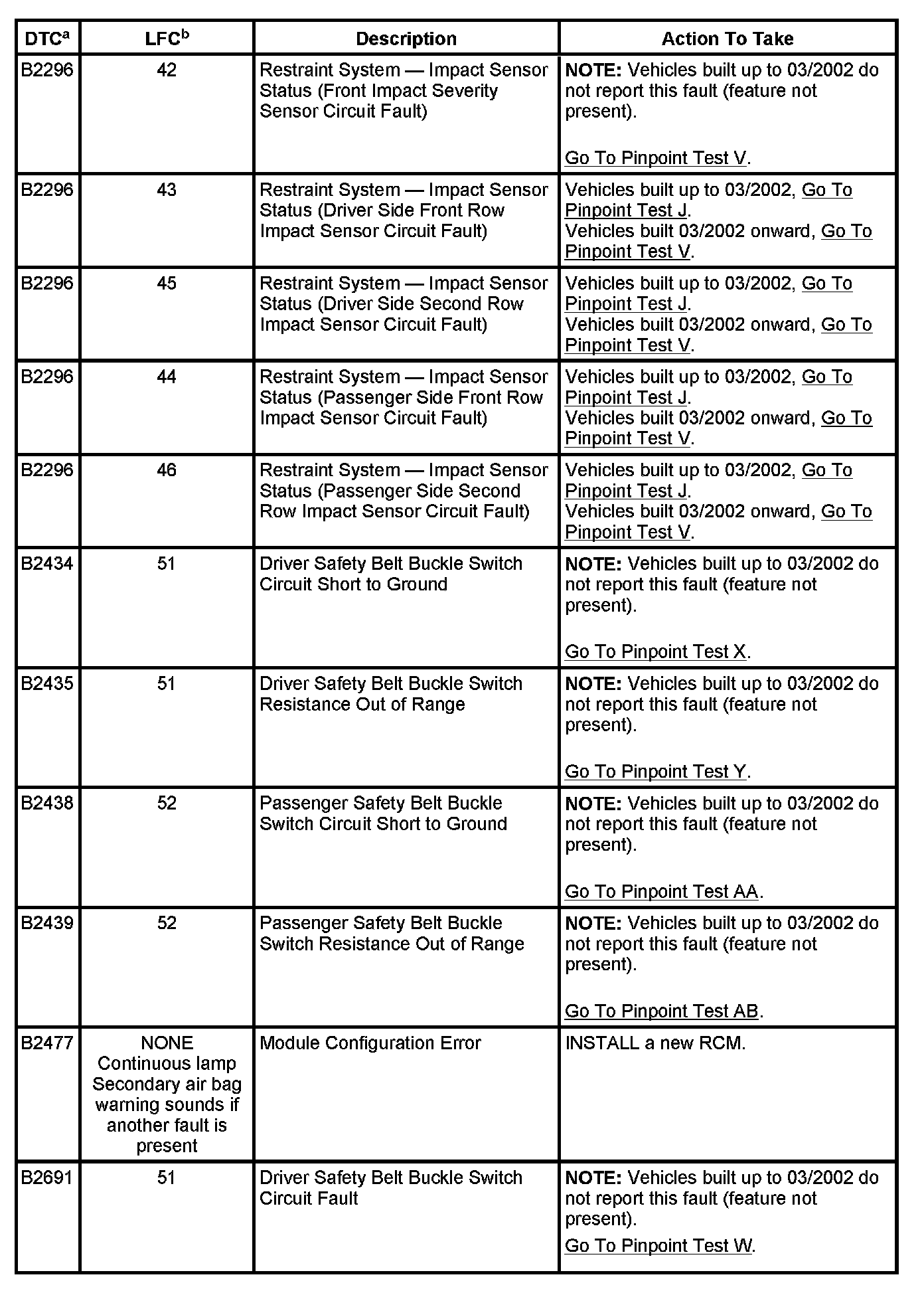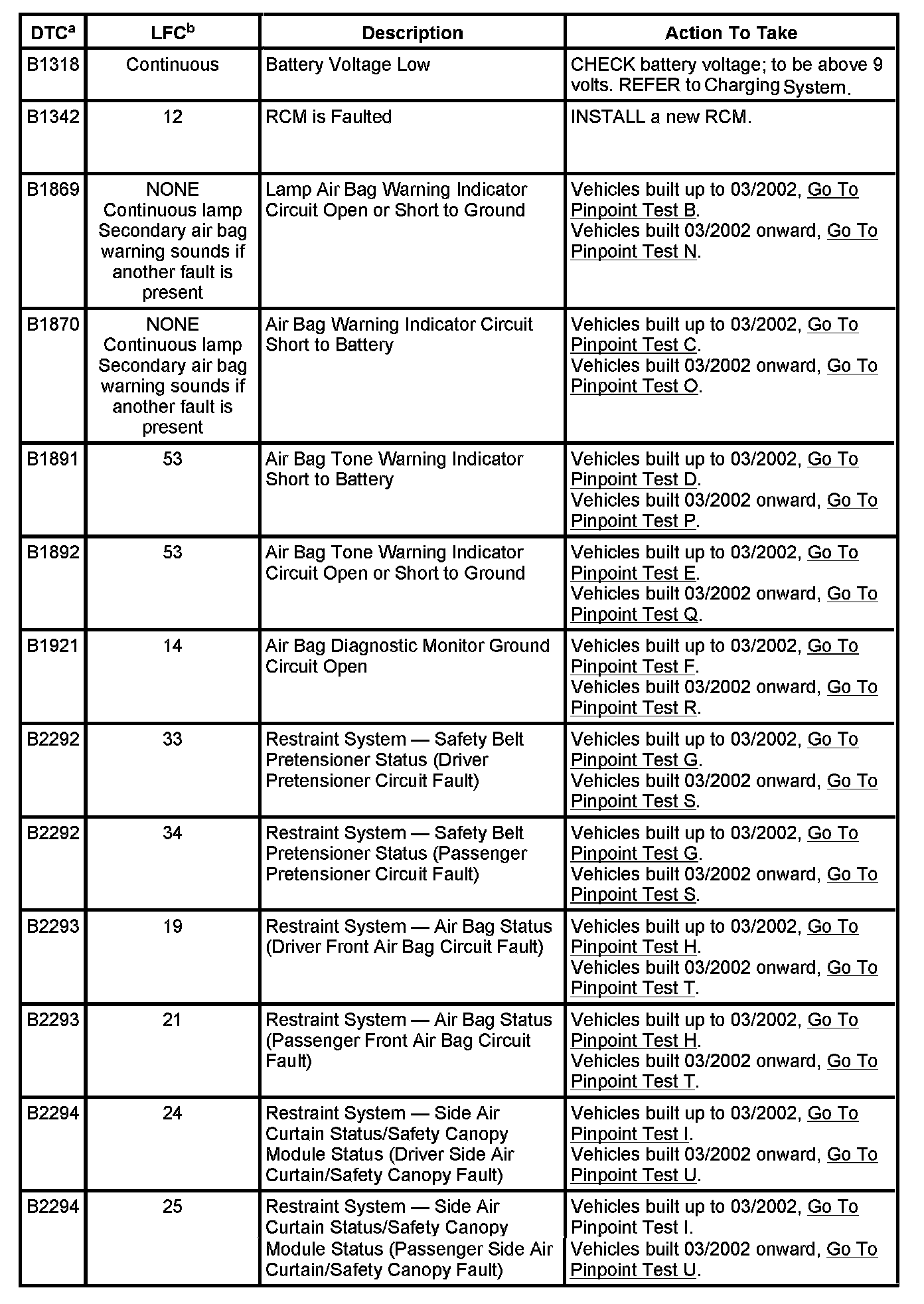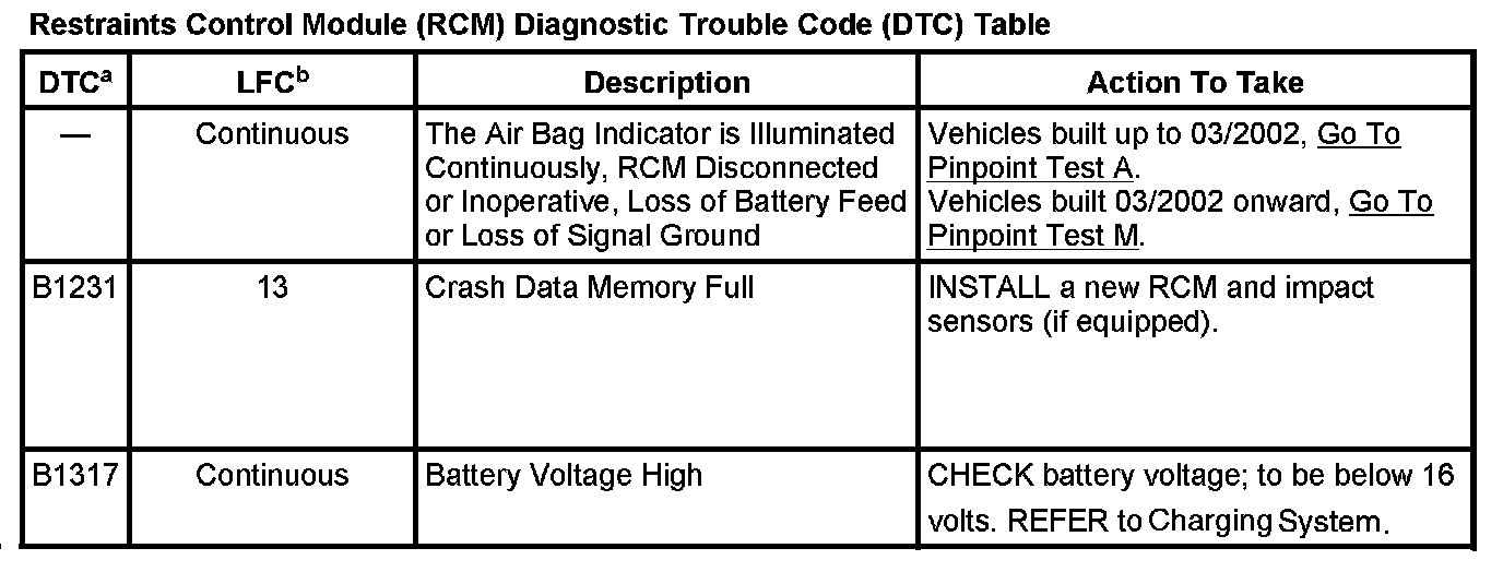 While the lamp fault codes (LFCs) are an indication of a general concern in the passive restraints system, the diagnostic trouble codes (DTCs) are more specific. The DTCs can be retrieved from the restraints control module (RCM) with a scan tool via the data link connector (DLC).