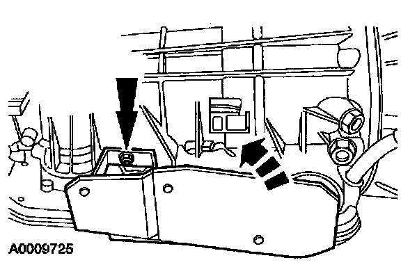 2. NOTE: If equipped, the transmission servo heat shield must be unclipped from the fluid pan rail and positioned aside for fluid pan removal.
