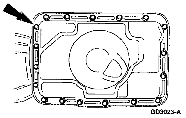 ^ Remove all the transmission fluid pan bolts except for two in the front. Loosen the two front transmission fluid pan screws. Pry the rear of the transmission fluid pan down and allow the fluid to drain. After the fluid is drained, remove the front two transmission fluid pan screws.