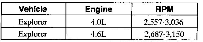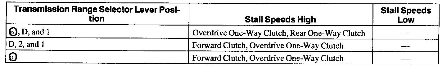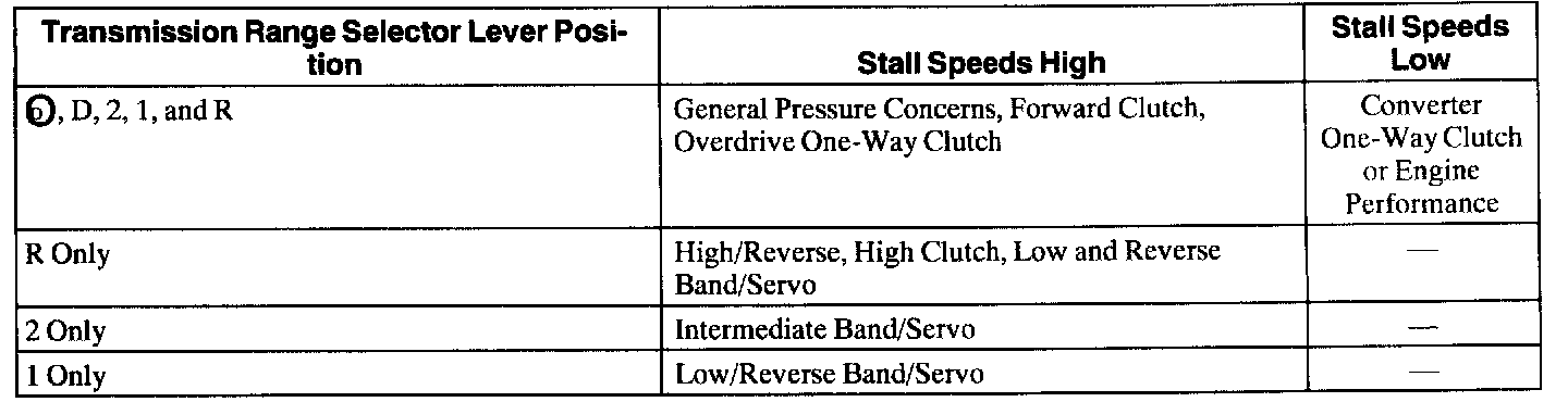 Press accelerator pedal to floor (WOT) in each range. Record rpm reached in each range. Stall speeds should be as follows: