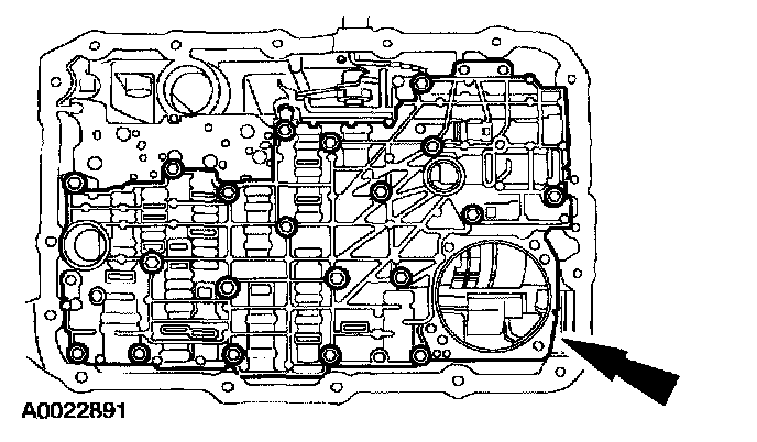Remove the 16 transmission fluid pan screws, fluid pan, and gasket.