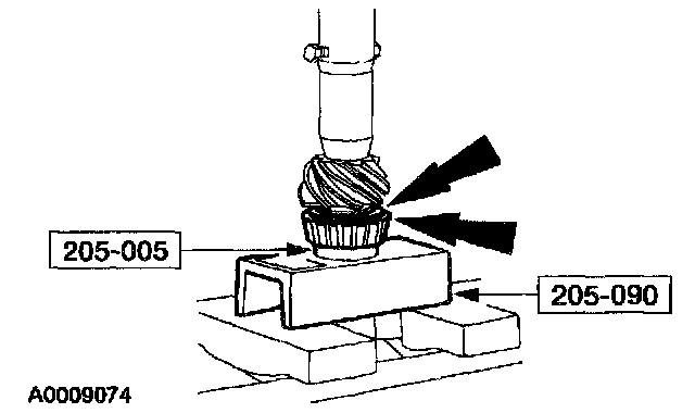 10. Using the special tools and a suitable press, firmly seat the drive pinion bearing adjustment shim and pinion bearing on the drive pinion gear stem.