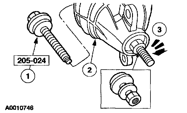 44. Remove the bolts. Apply Stud and Bearing Mount EOAZ-19554-BA or equivalent meeting Ford specification WSK-M2G349-A1 to the bolt threads, and reinstall the bolts.