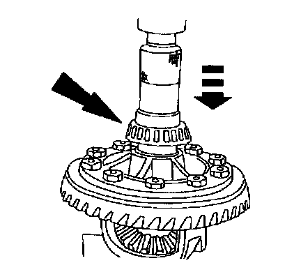 42. NOTE: The bolts retaining the differential ring gear to the differential case may interfere while carrying out this procedure. If so, remove three to five bolts to provide clearance.