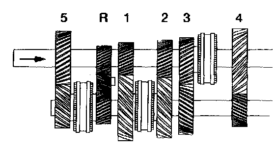^ The input shaft (gear) drives the fifth gear, first gear, second gear and the fifth/reverse synchronizer on the countershaft. It also drives the reverse idler gear.